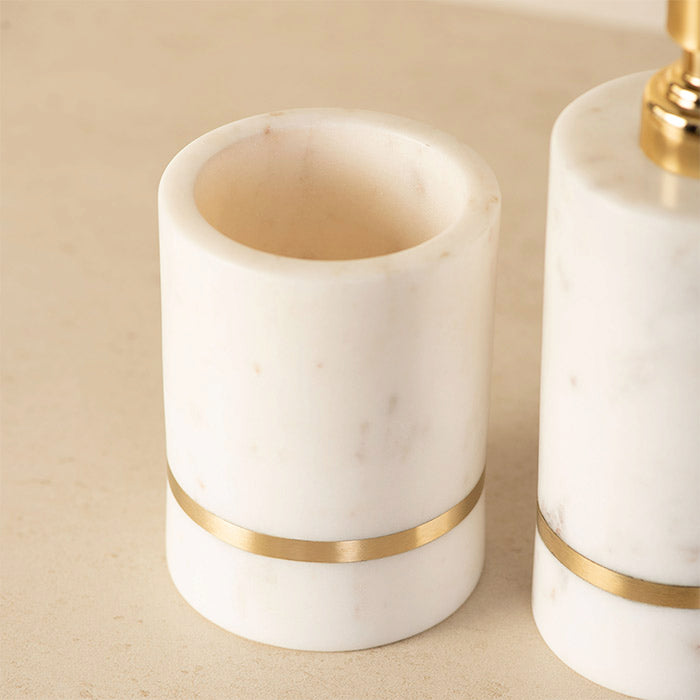 An epitome of aesthetic sensibilities, this brass inlaid bathroom set brings a touch of luxury to your powder spaces. Elegant and functional, the tumbler can be used to showcase your floral arrangements or display your bathroom essentials.